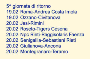 Mentre i Raggisolaris Faenza, dopo aver lottato con la capolista Roseto, faranno visita alla lanciatissima Npc Rieti ed i Tigers Cesena di coach Tassinari sfideranno proprio i rosetani, sulla carta appare molto più agevole il turno per l’Andrea Costa Imola, seppur in viaggio nella Capitale e per Ozzano.